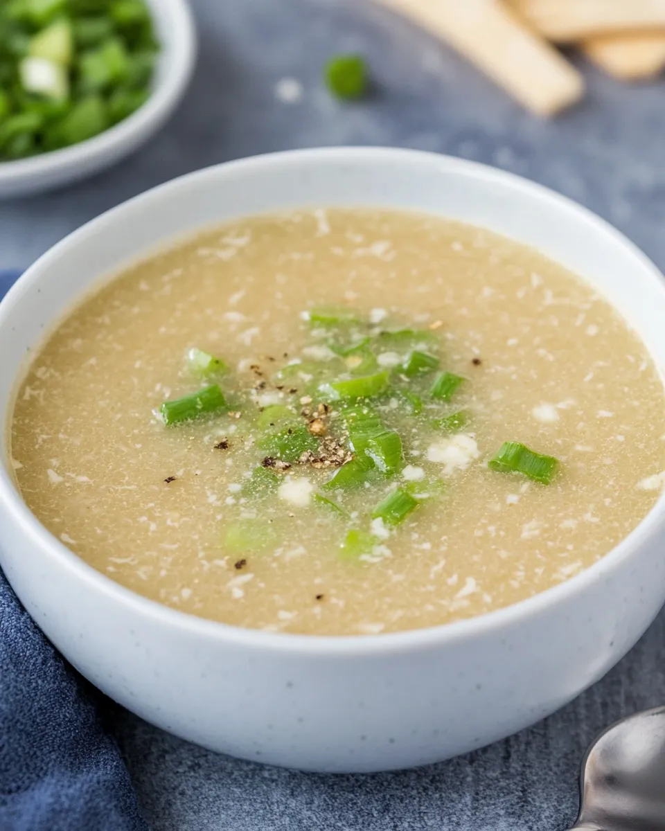 Ladle the hot soup into bowls and garnish with thinly sliced green onions. Serve immediately, and enjoy the warmth and comfort of your homemade Egg Drop Soup.